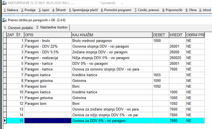 Nastavimo prenos iztržkov – paragonov po vaših kontih v Glavno knjigo. Prenos testiramo in predamo v produkcijo.